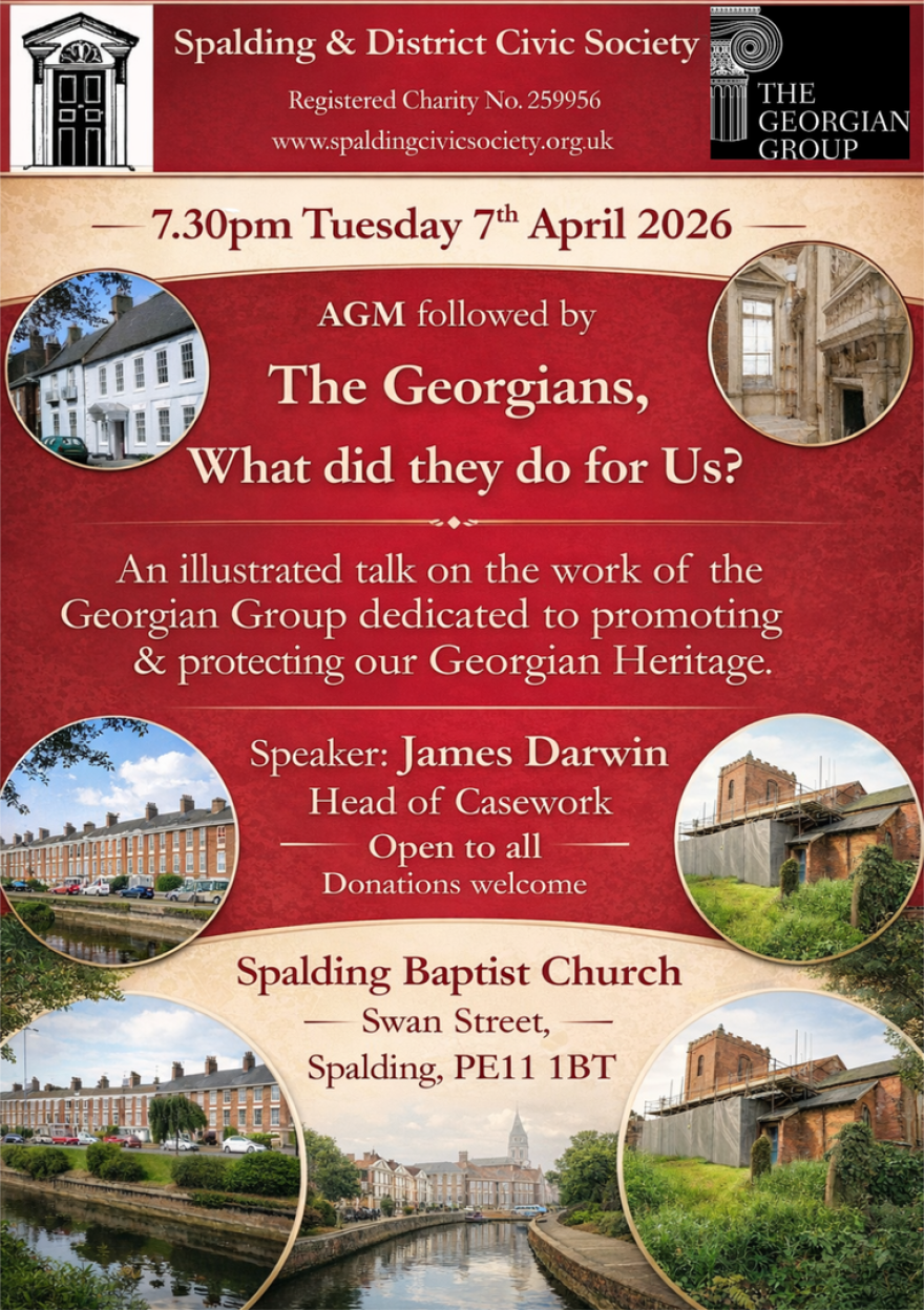 Spalding & District Civic Society are offering the opportunity to learn about the work of the Georgian Group which is dedicated to promoting and protection of our Georgian built heritage our AGM on Tuesday 7th April 2026.