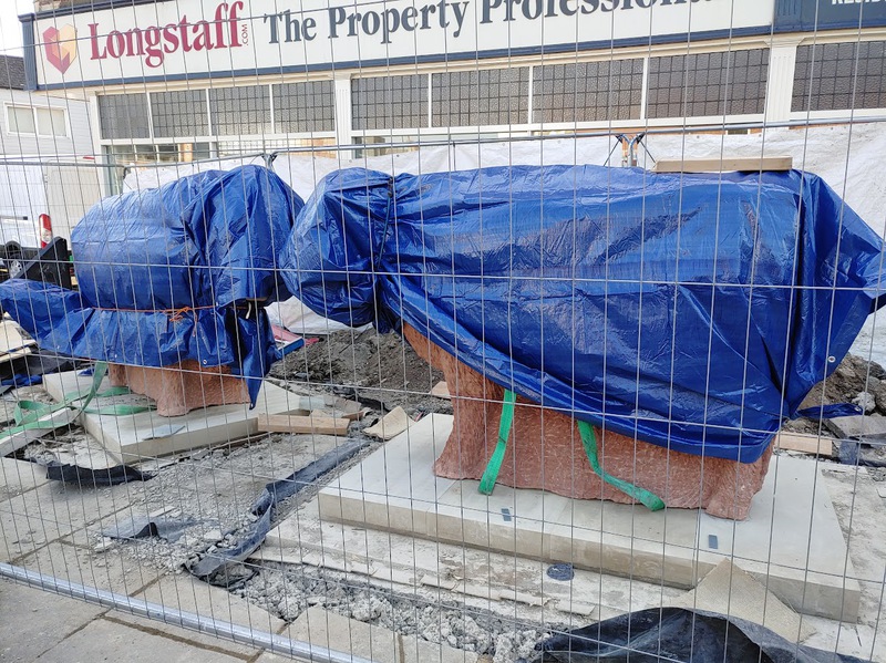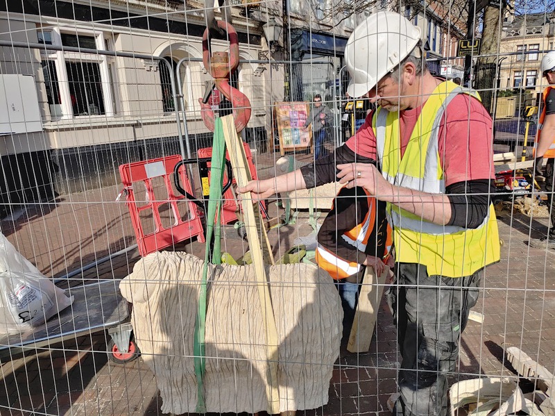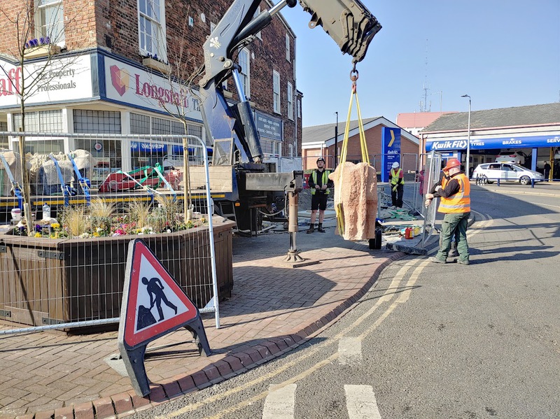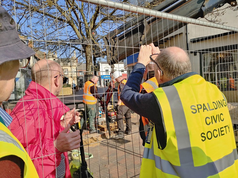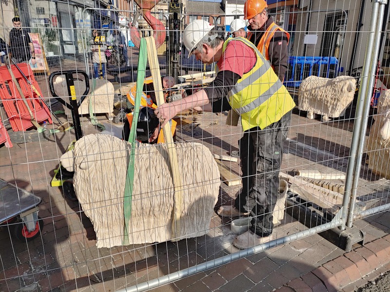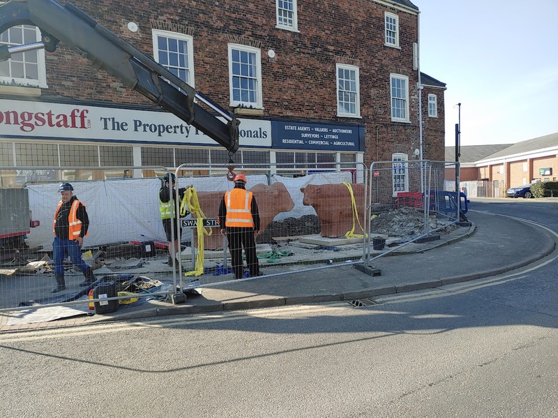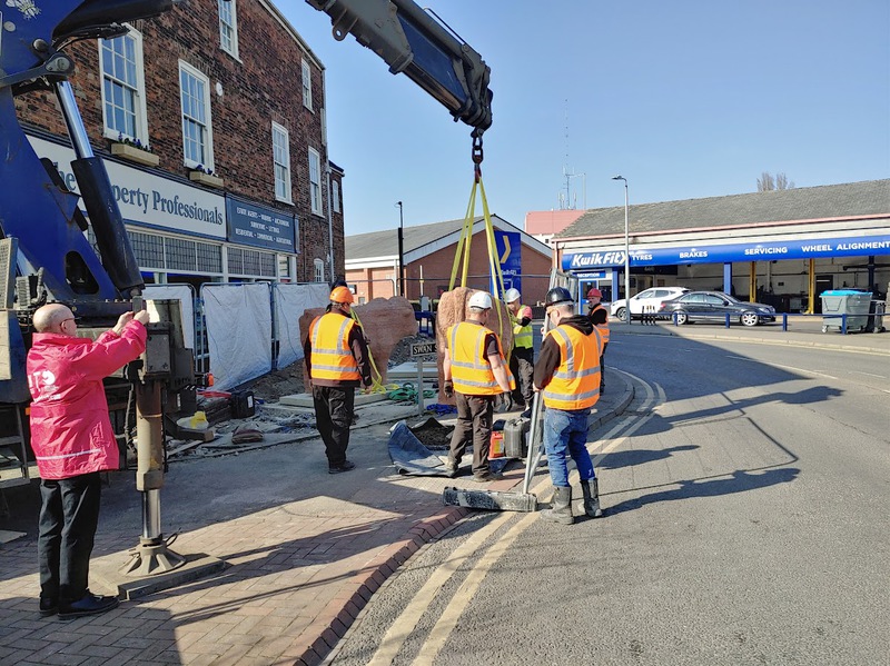 On Swan Street contractors from JRH Services of Lincoln dug out the ground for the foundations by hand to ensure that none of tthe underground utilities, before the foundation plinths designed by South Lincs Consulting Ltd were installed. Then on the day the sculptures were installed volunteers from the Civic Society, together with members of the Transported team were on hand to direct traffic during the installation which required New Road to be closed for a while. Throughout sculptor Graeme Mitcheson was on hand to ensure that scupltures were precisely positioned as he intended.