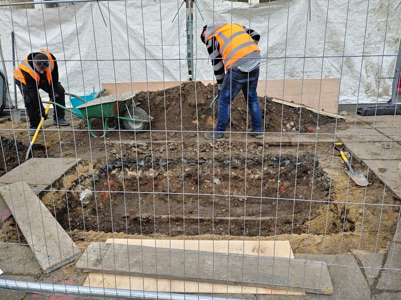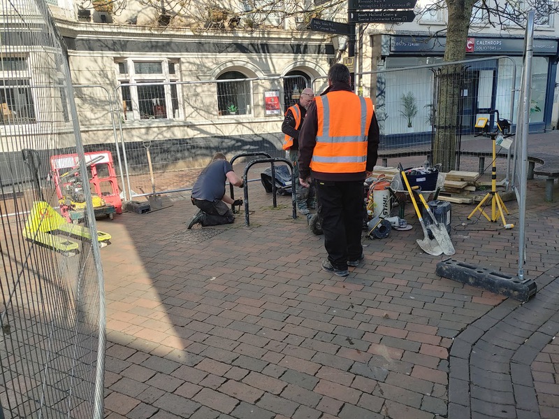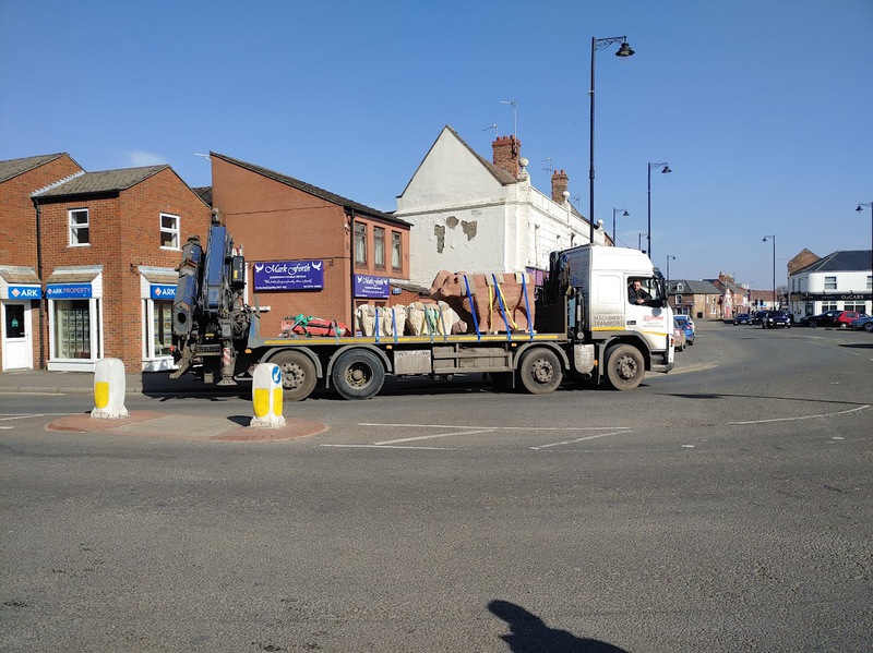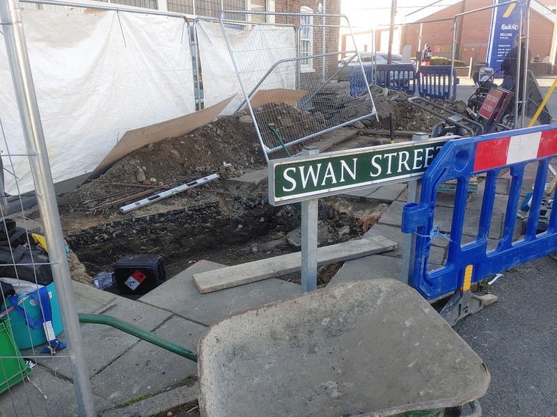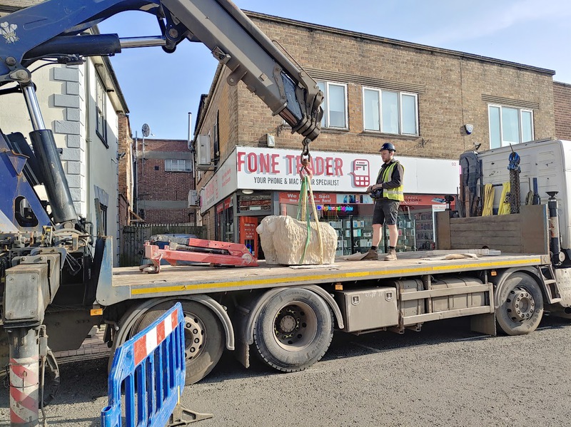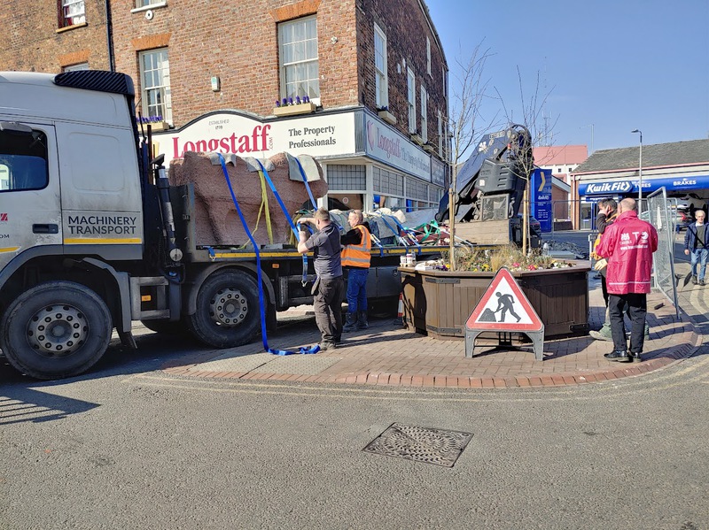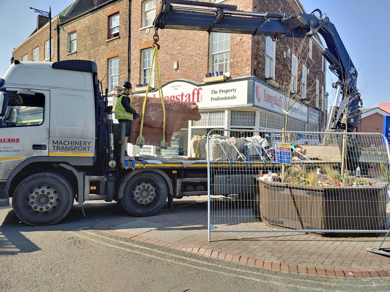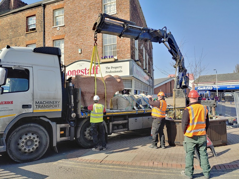 On Swan Street contractors from JRH Services of Lincoln dug out the ground for the foundations by hand to ensure that none of tthe underground utilities, before the foundation plinths designed by South Lincs Consulting Ltd were installed. Then on the day the sculptures were installed volunteers from the Civic Society, together with members of the Transported team were on hand to direct traffic during the installation which required New Road to be closed for a while. Throughout sculptor Graeme Mitcheson was on hand to ensure that scupltures were precisely positioned as he intended.
